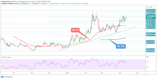 After its rebound at the ascending trendline connecting the Feb. 1 low of $0.0659 and the Apr. 6 low of $0.1779, the ZAP/USD is heading sideways. This may signal the end of the bearish price swing that began on March 13 at $0.4324 and ended at $0.1779 recently. The bearish correction stayed within the shallow retracement levels, which is characteristic of a bullish trend that is still going strong.