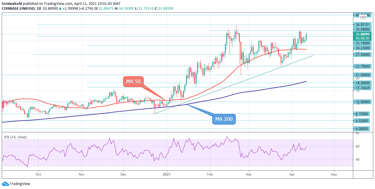 Bearish traders will target the MA 50 at $29.10 if the market continues to fall. LINK may find support for a rally at $30.23, just above the daily MA 50. If this fails, LINK will try to break through the $23.75 horizontal support line. If the $35 resistance level is broken, a push back well above all-time high of $36.92 is possible.