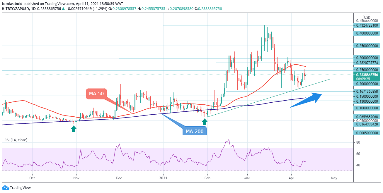 After its rebound at the ascending trendline connecting the Feb. 1 low of $0.0659 and the Apr. 6 low of $0.1779, the ZAP/USD is heading sideways. This may signal the end of the bearish price swing that began on March 13 at $0.4324 and ended at $0.1779 recently. The bearish correction stayed within the shallow retracement levels, which is characteristic of a bullish trend that is still going strong.