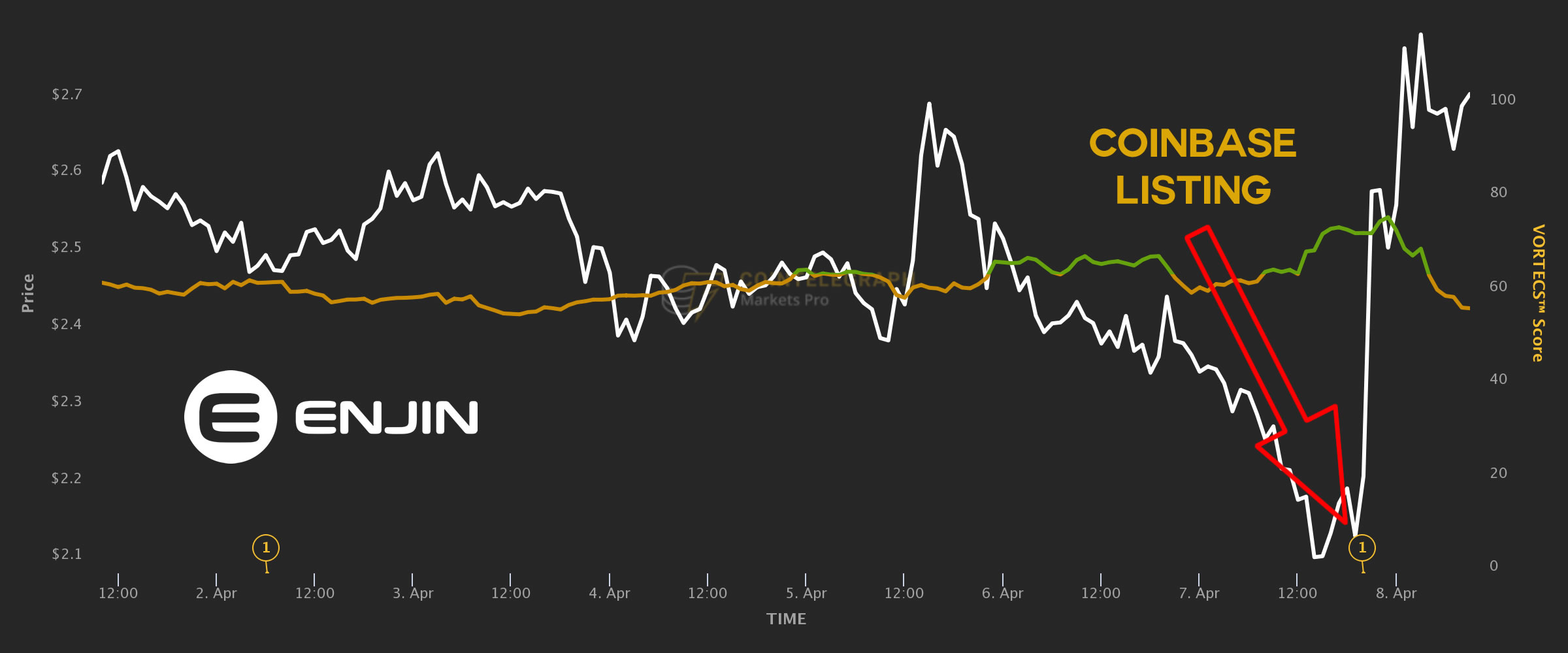As illustrated in the chart, the price of Enjin (ENJ), one of the tokens listed by Coinbase this week, had been gradually dipping after a major rally in March. As soon as the Coinbase news broke, however, the price of Enjin soared from a low of around $2.13 to over $3.90 — with the first few minutes of trading accounting for a substantial portion of that appreciation.