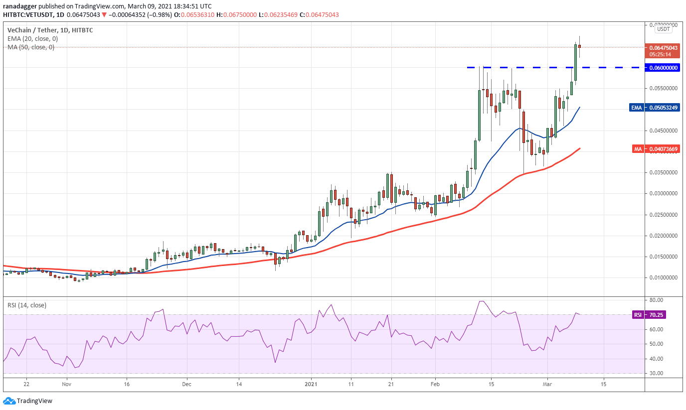 Currently, VET is in a strong uptrend. The bulls pushed the price above the $0.060 overhead resistance on March 8, signaling the resumption of the up-move.