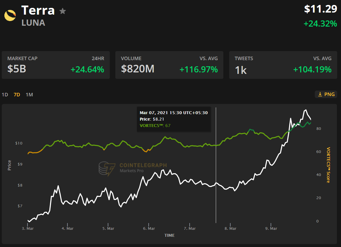Terra protocol’s LUNA token was trading for $0.6310 when it was featured on Dec. 29, 2020. Since then, LUNA price has skyrocketed to $12.12 which is a gain of 1,821% in about two and half months.