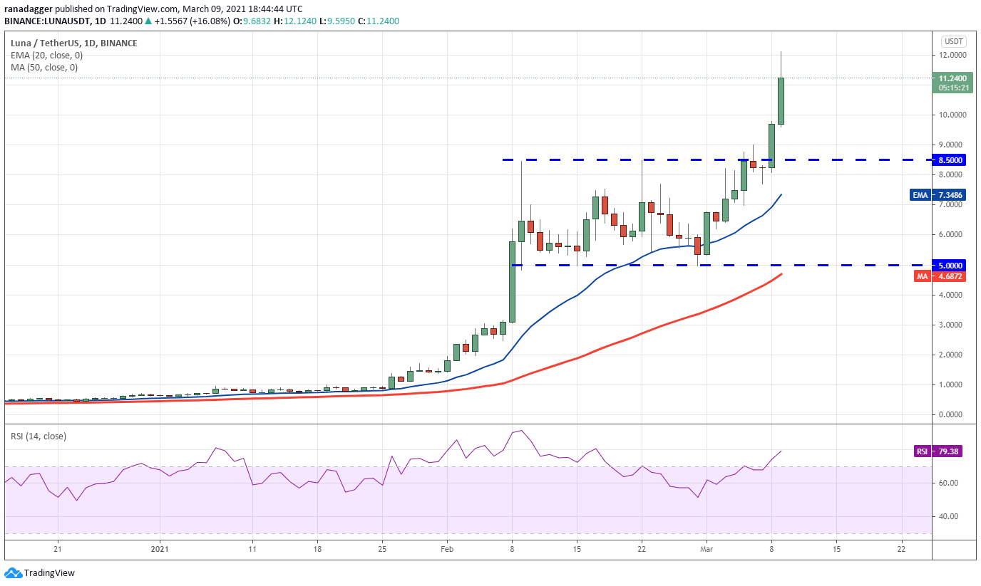 LUNA broke out of the $5 to $8.50 range on March 8 and picked up momentum, reaching the target objective at $12 today. Traders seem to have booked profits near $12 as seen from the long wick on the day’s candlestick.