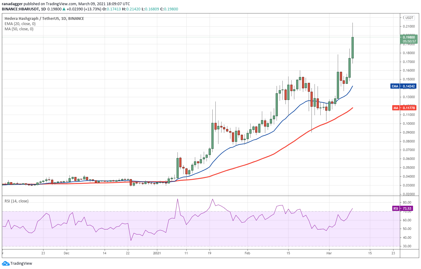Hedera Hashgraph (HBAR) was covered on Jan. 21 when it was trading at $0.10064. The token has rallied to $0.21420 today, a gain of 112% in just a month and a half.
