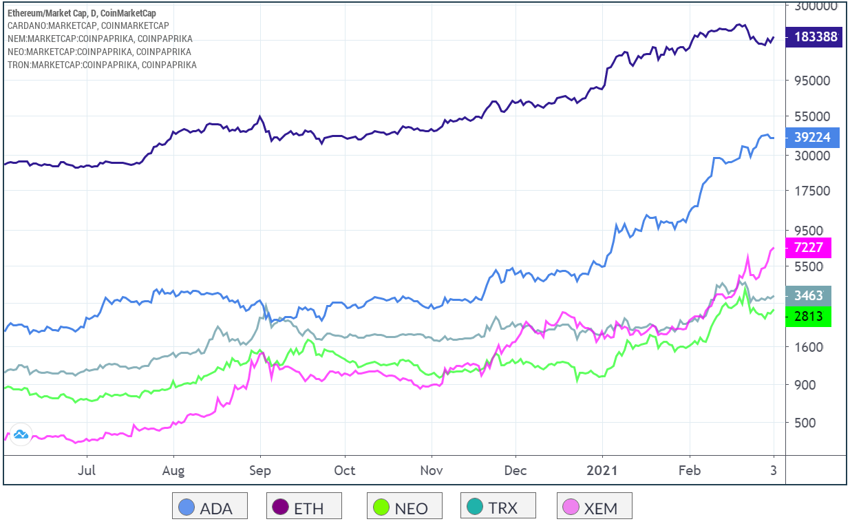 This data should, at least theoretically, be reflected in the market capitalization. Thus, it makes sense for Ethereum to dominate the ranking as no other network is even close to its decentralized applications.