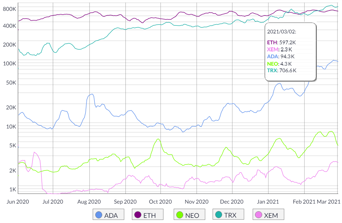 Oddly enough, the Tron network holds over 14.5 billion of the Tether (USDT) in circulation, which by itself should boost network usage metrics. Meanwhile, Cardano has 90% fewer daily active addresses than Ethereum, yet, both networks handle the same amount of transfers and transactions.
