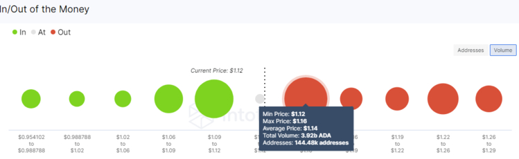 According to IntoTheBlock’s In/Out of the Money Around Price (IOMAP) metric, an approximate 144,000 addresses bought 3.9 billion ADA at levels between $1.12 and $1.16. Therefore, ADA’s price presents a critical support level in that area.