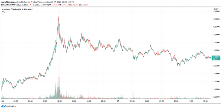 ADA trades at $1,18 with moderate losses in the 24-hour chart and sideways movement in the last hour. During the past weeks, ADA has followed the general market sentiment and present an 8.3% loss.