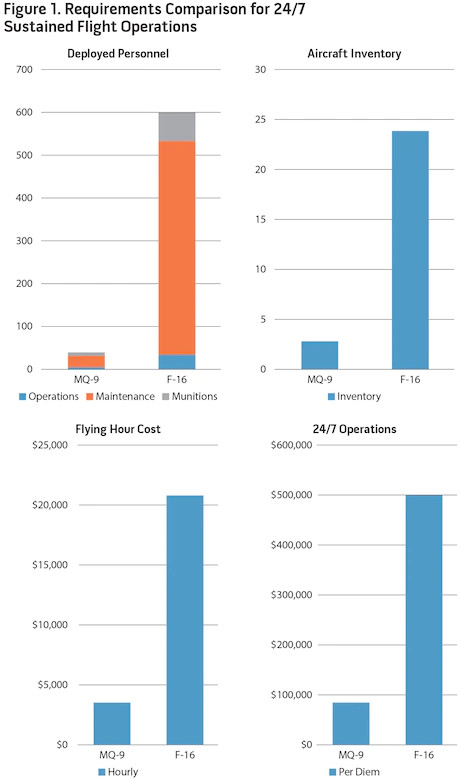 These personnel savings manifest themselves in significant financial savings from mobilization costs and deployed financial entitlements as well as aircraft operating costs. To support sustained airstrike capability the hourly difference to operate an MQ-9 versus an F-16 is over $17,000 and nearly 6,000 pounds of fuel.37 Per diem, this results in a savings of nearly $420,000 and 187,000 pounds of fuel with one MQ-9 sortie versus 24 F-16 sorties, according to a RAND study.38