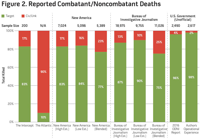 Figure 2 analyzes sample data of RPA strikes (comparing reported enemy deaths to those of assessed noncombatants) from four media outlets, the Office of the Director of National Intelligence (ODNI), and my own personal experience having commanded and directed over 6 years of RPA strikes across seven countries. Of note, because the duration of reporting periods differs among all sources, the reported sample size is included in the figure.