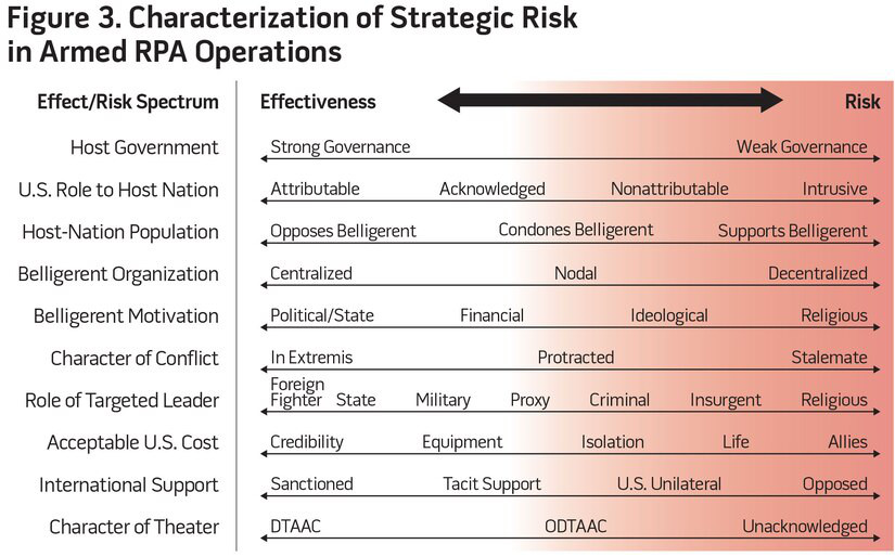 The strategic risk model is not intended to be a checklist-based examination on the efficacy and risk of RPA decapitation strikes, but instead to provide analytical context to policy decisions. The model asserts that an attributable U.S. strike against a leader within a strong bureaucratic state, sanctioned by international support, within a declared theater of conflict is likely the most effective and least risky type of decapitation strike. In contrast, the model asserts that the least effective (and highest risk) decapitation operations are against leaders of decentralized, religiously motivated organizations with weak host-nation governance and strong host-nation popular support. Adding to the challenge, the complex interactive relationship between risk and effectiveness is neither binary nor directly opposed; it is unique to each operational environment, pointing to a greater need for constructive analysis and dialogue prior to commencement of decapitation strikes.