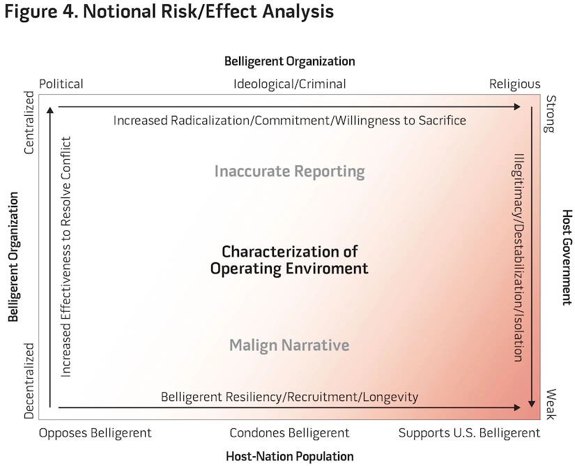Figure 4 represents this notional risk/effect analysis portraying the complex interactions of the operating environment based on 4 of the 10 principles. In understanding and accounting for inherent risks of RPA strikes (policy opacity, inaccurate reporting, and malign narrative), policymakers must deliberately forecast and anticipate the effects on popular sentiment, the host-nation government, the belligerent organization, and the belligerent’s motivation. In this figure, we highlight those characteristics that increase strategic risk, manifesting in potential unintended consequences and what the CIA refers to as “blowback.”63