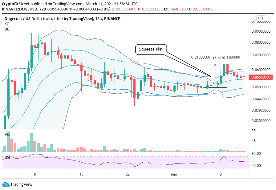 On the 12-hour chart below, DOGE price squeeze play was triggered on March 5 when the lower Bollinger Band moved inside the Kelter Band. Dogecoin price gained almost 28% before finding resistance just below the .50 retracement level at $.0645