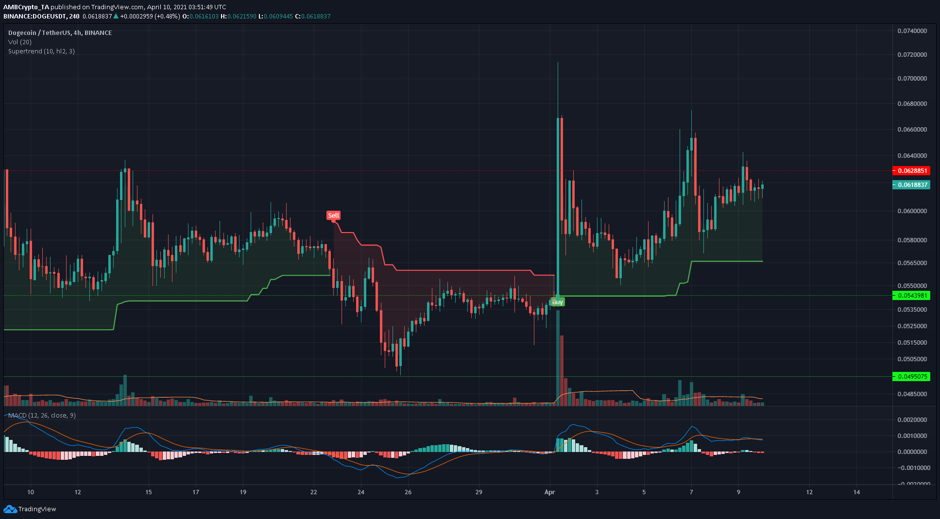While the Supertrend indicator gave a buy signal for DOGE on the 4-hour charts, the MACD showed a lack of momentum in the past 24 hours. The resistance at $0.062 was not yet overcome, and trading volume was minimal in the past few sessions.