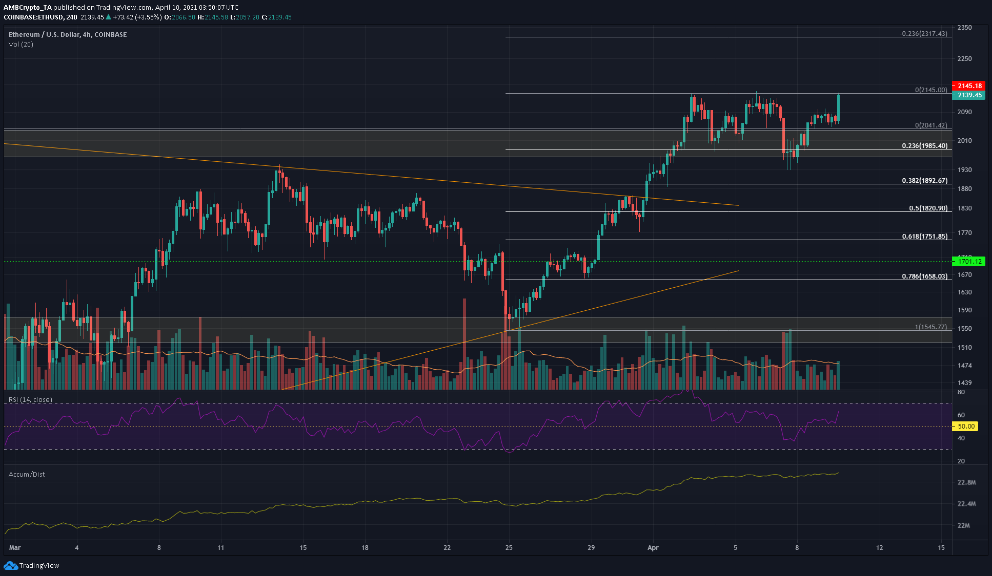 ETH was once more knocking on the doors of the $2150 resistance. The Accumulation/Distribution continued its uptrend to show accumulation, and a breakout upwards looks likely in the next few hours. The RSI also climbed back above neutral 50 to indicate a shift in momentum.