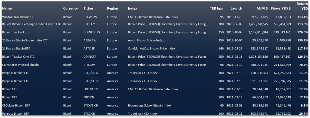 Starting off with the biggest and most well-known cryptocurrency, we see a competitive market with 14 funds now available worldwide. For once, the US was late to the party, meaning that European investors have a far wider range of choices than their transatlantic counterparts.