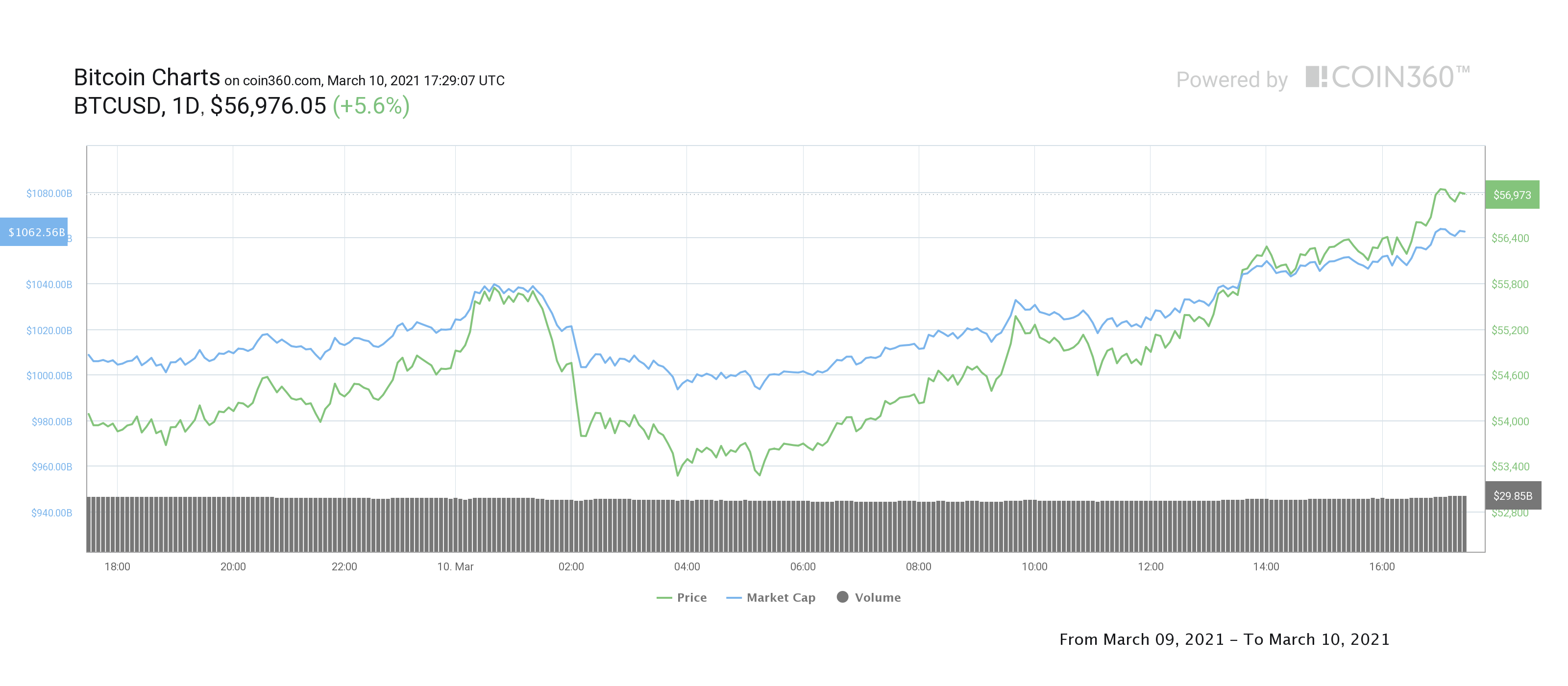 Within the last hour, Bitcoin (BTC) price surged to $57,100, a level not seen since Feb. 20 when BTC price made a new all-time high at $58,352. The bullish breakout signals that investor sentiment has shifted back in favor of bulls and it increases the likelihood that BTC will attempt a run at the $60,000 level.