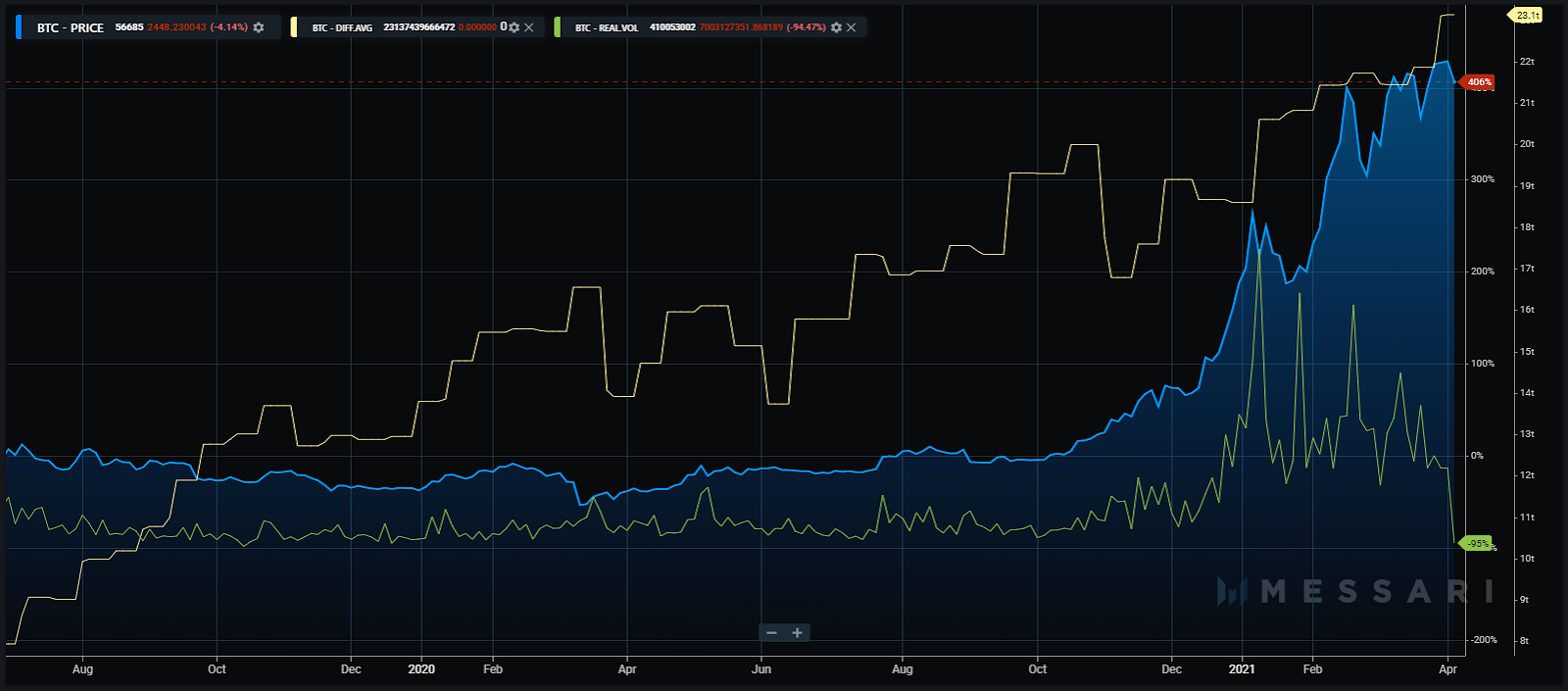 “In September, 180-day volatility on the crypto about matched the all-time low from October 2015. From that month’s average price, Bitcoin increased a little over 50x to the peak in 2017.”