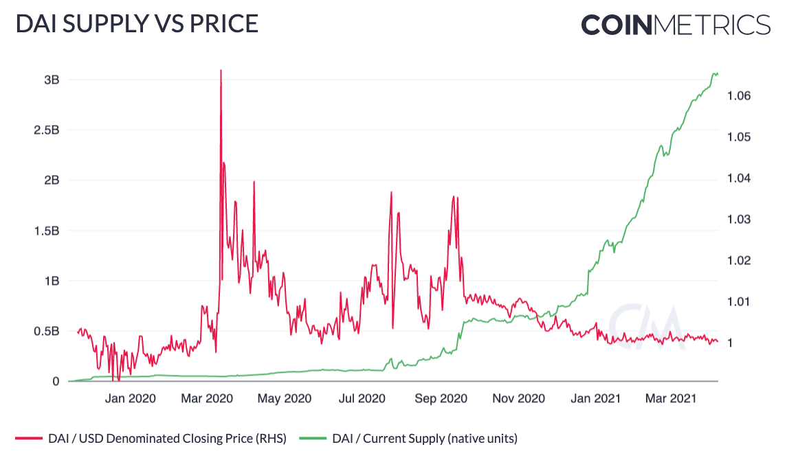 The growth in the supply of DAI is in part due to its use across a number of DeFi protocols including AAVE, Compound (COMP) and Cream Finance (CREAM) as the go-to option for a decentralized stablecoin.