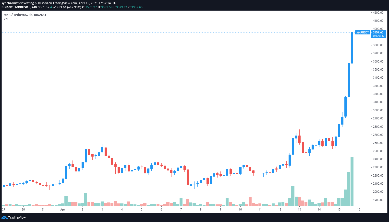 Data from Cointelegraph Markets and TradingView shows that the price of MKR has increased by almost 100% in the past week, rallying from a low of $2,011 on April 7 to a new all-time high at $4,096 on April 15 on surging trading volume.