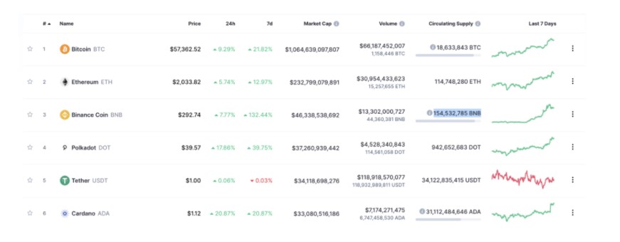 | Binance Coin (BNB) | $277.82 | $42.8 billion | $10.3 billion | 154.5 million BNB |