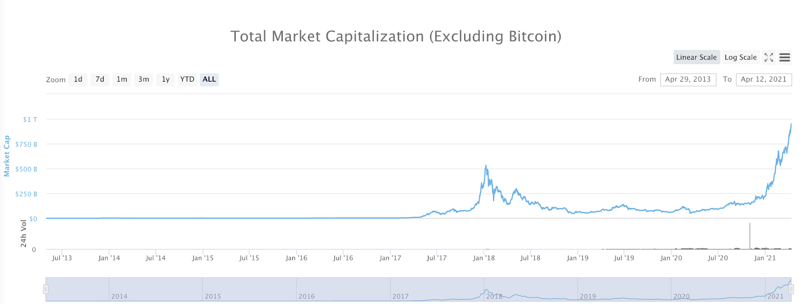 Total market capitalization of cryptocurrencies besides Bitcoin is sharply rising this year. Courtesy: CoinMarketCap