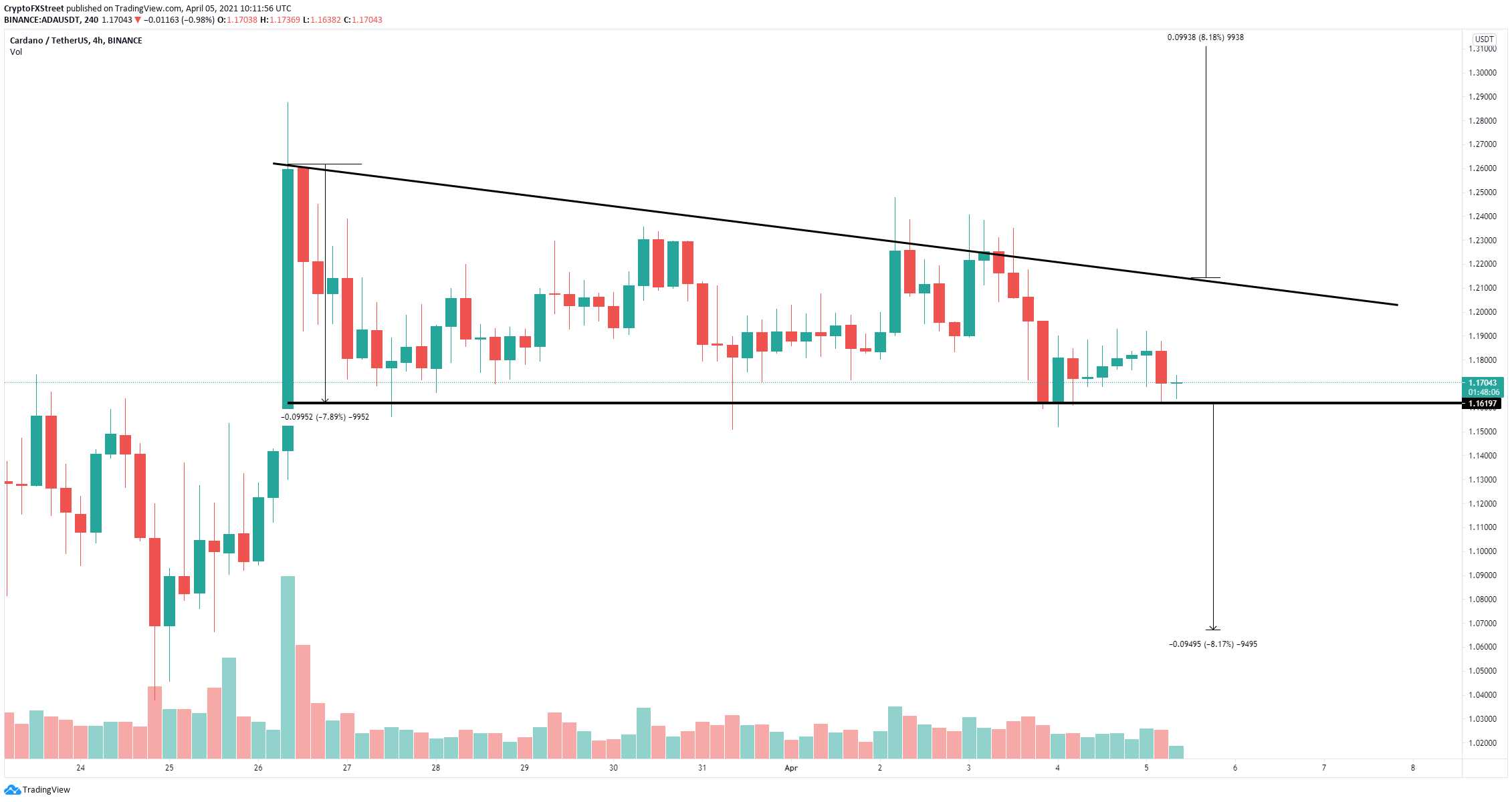 - Cardano price is contained inside a descending triangle pattern on the 4-hour chart.