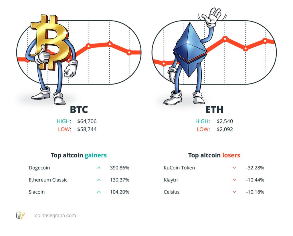 Among the biggest 100 cryptocurrencies, the top three altcoin gainers of the week are Dogecoin, Ethereum Classic and Siacoin. The top three altcoin losers of the week are KuCoin Token, Klaytn and Celsius.
