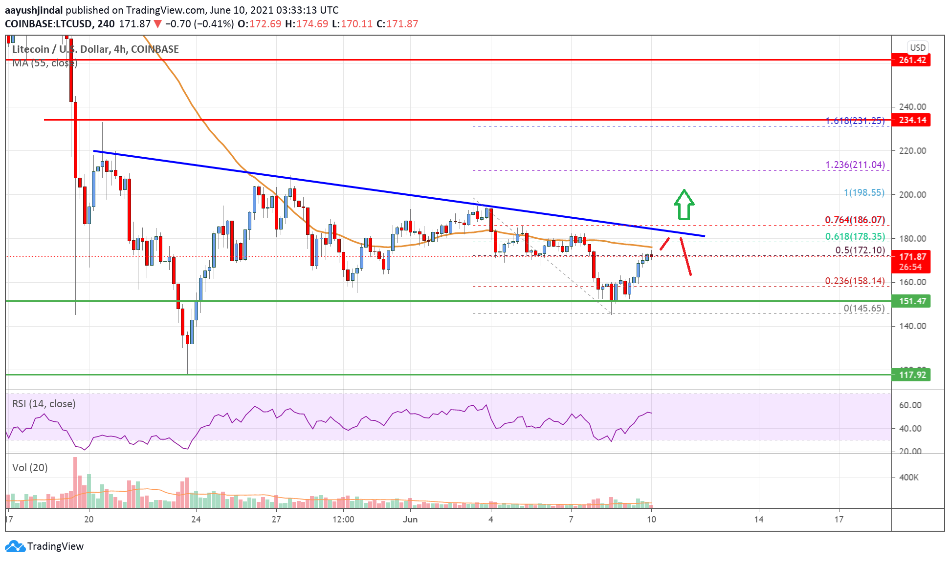 - LTC price is still trading well below $180 and the 55 simple moving average (4-hours).